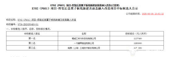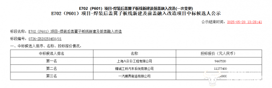 在本次变更中遗憾出局的晓奥(上海)工程技术股份有限公司成立于1992年6月9日,其中一个项目的全称为“E702(P601)项目-焊装后盖翼子板线新建及前盖融入改造项目”,甚至排名顺序都完全一致。